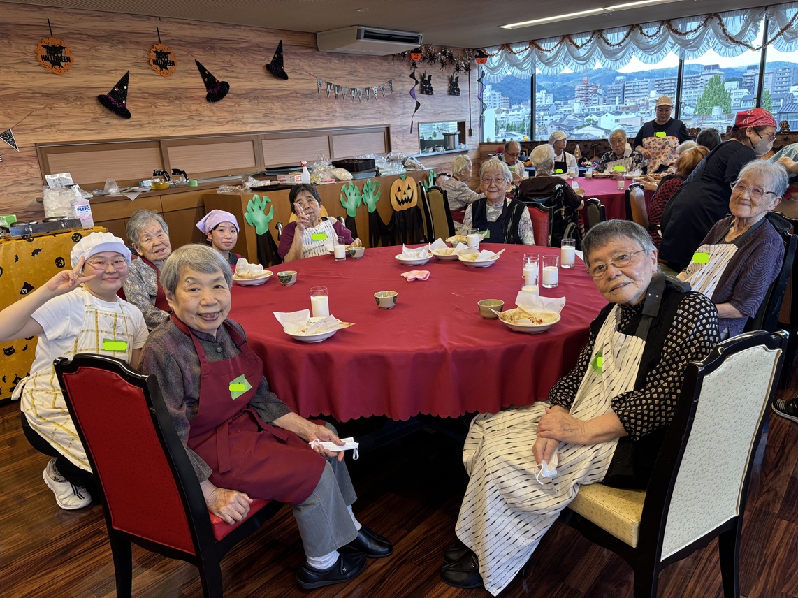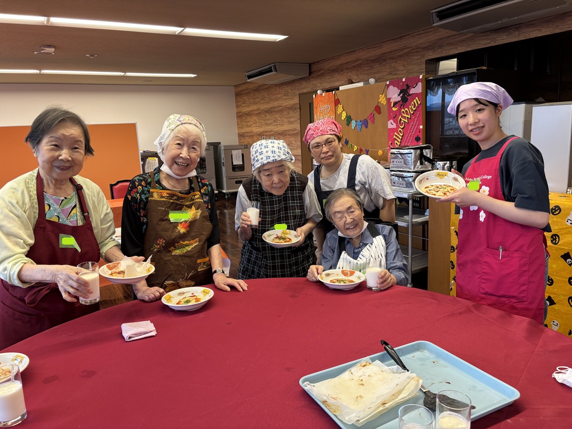 10月は京都栄養医療専門学校から実習生が来ており、ミニ栄養講座を担当してもらいました! 「さあ にぎやかにいただく」を合言葉にフレイル予防についてとても分かりやすくお話してくださいました。