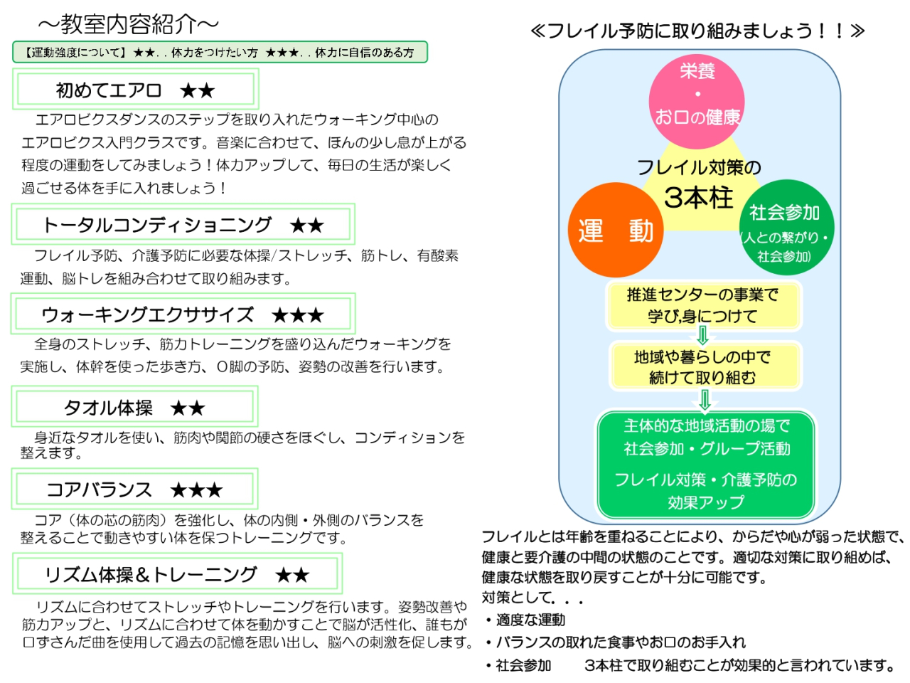 様々な内容の教室があり、ご自身の体力レベルに合ったものや、