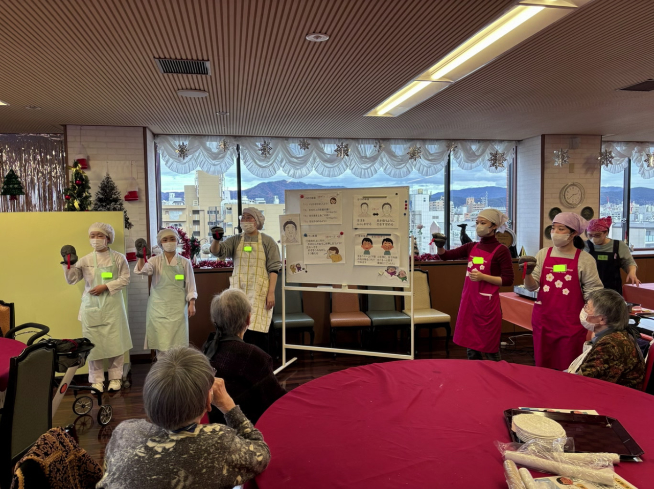 10月は京都栄養医療専門学校から実習生が来ており、ミニ栄養講座を担当してもらいました! 「さあ にぎやかにいただく」を合言葉にフレイル予防についてとても分かりやすくお話してくださいました。